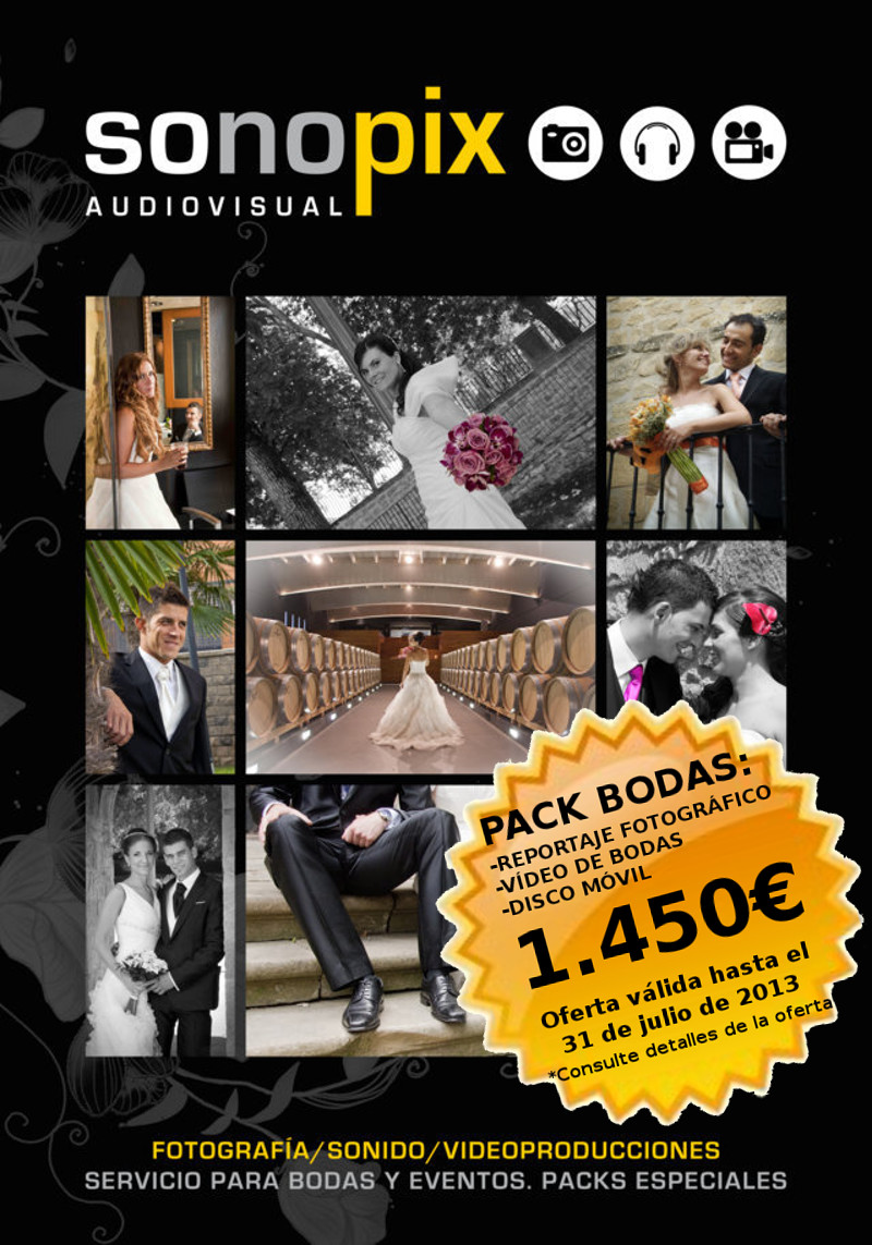 POMOCIÓN ESPECIAL PARA RESERVAS EN JULIO. AHORA DOS ÁLBUMES EN 25X15 PARA LOS PADRES AL RESERVAR TU REPORTAJE DE BODAS Y ADEMÁS UN 10% DE DESCUENTO SI CONTRATAS LA FOTOGRAFÍA Y LA DISCOTECA. WWW.SONOPIXBODASNAVARRA.COM